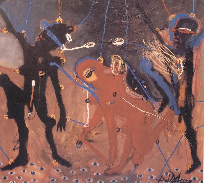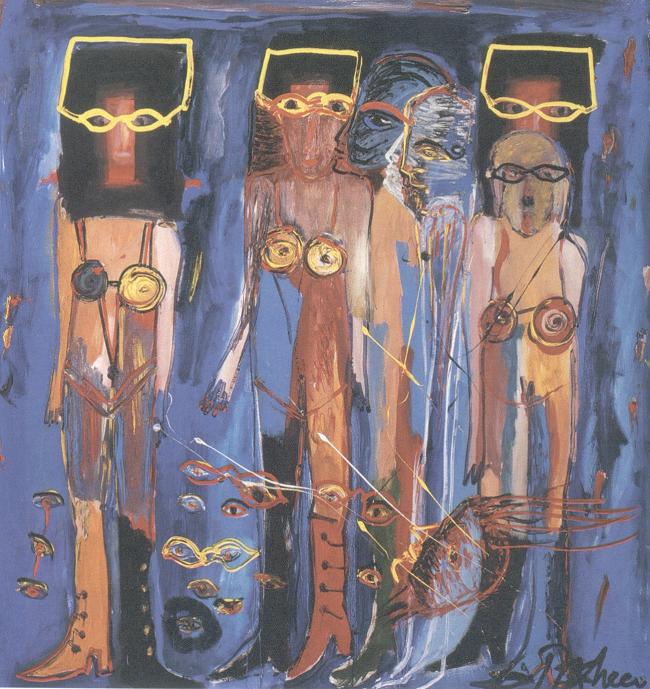Personagens presentes em quadros e painéis policromáticos. Aspectos ligados ao território da fantasia humana em seus desejos secretos, desenvolvidos num esforço solitário, independente, com muita investigação, pesquisa e dedicação exclusiva ao exercício da pintura.