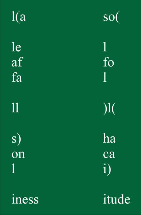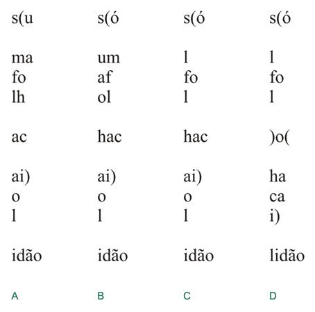 Nas terceira e quarta tentativas (C, D), utilizei o éle (l) como o número um (l), recurso que já está no original e que Augusto utiliza muito bem na sua tradução.