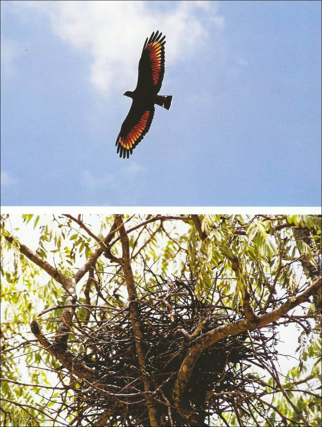 Abaixo, ninho em local isolado, pois tem hábitos solitários, localizado no alto duma árvore de grande porte.