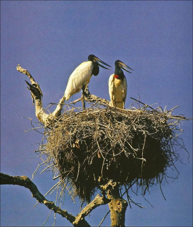 Ao contrário das garças, que nidificam em colônias, os tuiuiús (Jabiru mycteria) fazem seus ninhos no alto das grandes árvores, isoladamente.  Ave-símbolo do Pantanal mato-grossense, pertence à família das cegonhas, alimenta-se de peixes e insetos.