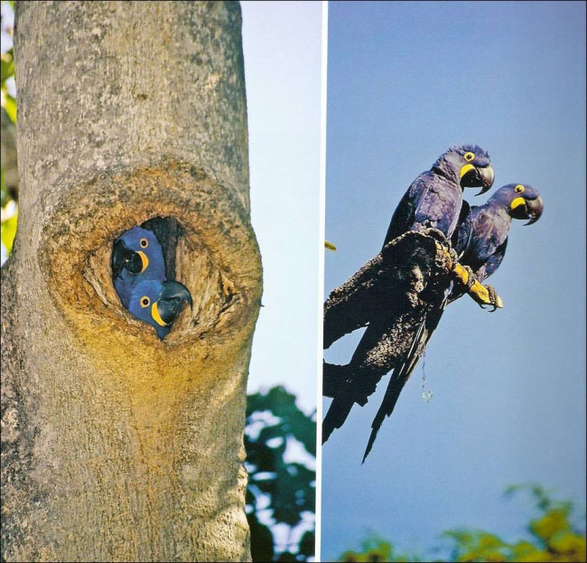 Os casais de araras-azuis-grandes (Anodorhynchus hyacinthinus) do Pantanal do Mato-Grosso nidificam em aberturas de árvores com troncos mais largos, e se mantêm unidos por toda a vida. Está ameaçada de extinção, seja pela caça e o comércio, como pela degradação do seu habitat natural.