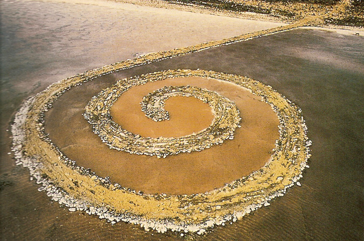 Em 1970, Robert Smithson construiu numa região industrial abandonada no Grande Lago Salgado, Utah, EUA, a gigantesca Spirral Jetty (Quebra-mar em espiral). O pier como o local da arte. Inventando uma nova paisagem. Desaparecida em 1972. Com uma largura de cinco metros, comprimento de quinhentos, o redemoinho/estrada artificial feito(a) de pedras de basalto, barro e sal cristalizado, que se projeta nas águas avermelhadas devido à presença das algas e resíduos químicos, revela um signo e figura matemática importantes. Essa linguagem geométrica, com suas imensas esculturas surgidas do solo, revela também diálogos com o minimalismo.