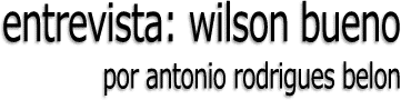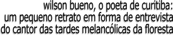 No cumprimento da tarefa de apresentar  Wilson  Bueno  seguem  as  breves notas biográficas e as anotações sobre as principais produções do autor. Antecipar, precedendo às falas do entrevistado, informações sobre as suas obras e atuação, bem como de suas idéias em relação à literatura, arte e política, valeria apenas à guisa de entrada na saborosa ― e saberosa ― entrevista. Valem e pesam as palavras de Wilson Bueno. O processo cuja resultante é a entrevista começou em março de 2009, nos seus primeiros contatos; terminou em julho, na sua execução em jorro. O autor de Meu Tio Roseno, A Cavalo, escrevia concentradamente um novo livro; precisava de um tempo e o leitor-entrevistador tinha o tempo da espera. As perguntas estavam lá, enviadas por e-mail; em poucos dias, menos de dez, ele respondeu tudo. Disponibilidades do entrevistado e do entrevistador foram respeitadas; completaram-se. Dos primeiros contatos, seguidos dos acertos de pormenores, aos passos de execução e encerramento da tarefa, tudo muito tranquilo, sereno. O material da entrevista comporta certamente mais de uma versão. Vai aqui uma quase crua; importa o pulsar da escrita de Wilson Bueno. A quem, os habituados às coisas da literatura brasileira contemporânea, algo soar o já sabido, é assim mesmo. Outras falas dirão muito de Wilson Bueno, singularmente. Exemplificando uma das singularidades, cabe a informação fundamental do nome de seu "testamenteiro fiel", um importante editor brasileiro atual. Fatos, concepções de literatura, de vida, de mundo, em simplicidade e riqueza escorreitas.