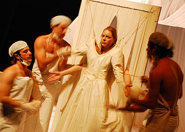 CP - No teatro, além da seminudez de Vestido de Noiva, fiz por dois anos A Filosofia na Alcova, que tinha cenas de nudez e violência sexual. Foi importante pra mim, mas não posso dizer que é confortável, prefiro não fazer. Tem vezes que o espetáculo pede e a nudez realmente é necessária, daí compreendo, mas tem também outro jeito, quando o espetáculo pede nudez e você perverte às avessas... Acho que hoje é ultrapassada essa ideia de que ficar nu é transgressor. No cinema, fiz também cena de nudez, mas nesse caso acho bem mais constrangedor, tem uma equipe geralmente grande, tem pausas, problemas de luz... Agora, acho que o pudor não é só do corpo e todo ator tem suas limitações, que no meu entendimento são menos graves quando apenas físicas...