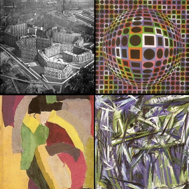 NOVO BRUTALISMO: a primeira vez que o termo surgiu foi em 1953, num artigo da revista britânica The Architectural Review, aliando a expressividade da ARTE BRUTA e as novas possibilidades que Le Corbusier fazia do Béton Brut (Concreto Bruto/Betão Bruto). O casal inglês Alison e Peter Smithson apropria-se do termo, e funda um movimento para trabalhar a ideia de numa nova arquitetura, que não esconde as suas estruturas nem o uso de materiais específicos e, tampouco, o objetivo de um estilo vigoroso, preciso e claro para projetos habitacionais sociais (escolas, hospitais, etc.), necessários para a Inglaterra, após a Segunda Guerra Mundial. O NOVO BRUTALISMO foi um movimento com projetos arquitetônicos funcionais, eficazes e integradores das ideias iniciais do MODERNISMO, com o funcionalismo da ESCOLA DE CHICAGO e as aspirações sociais do ESTILO INTERNACIONAL. O NOVO BRUTALISMO tem um objetivo maior, que é levar ao máximo a expressividade natural do concreto, do tijolo, vidro, não se importando com os detalhes do refinamento e sofisticação. As edificações devem deixar à mostra seus materiais, bem como as técnicas aplicadas. Teve influência internacional, perdurando até os dias de hoje. Artista e obra: Jack Lynn e Ivor Smith (abaixo).