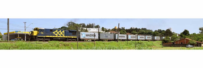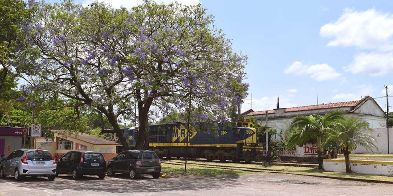 Quando as vias rodoviárias e ferroviárias se cruzam e um trem da empresa MRS Logística S.A.