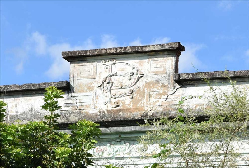 Detalhes da fachada do prédio contendo a sigla CP (Companhia Paulista) referente à empresa Companhia Paulista de Estradas de Ferro na primitiva Estação Ferroviária de Valinhos, inaugurada em 31 de março de 1872. Valinhos/SP, 2016. Abaixo da fachada, nota-se a data de 1915, quando a primitiva estação foi convertida em residência do chefe da estação.
