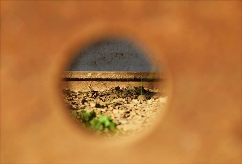 Um trilho de trem visto pelo furo existente na alma de outro trilho. A alma é a parte central do trilho, localizada entre o patim e o boleto. Valinhos/SP, 2016. Esses furos são utilizados para que possam ser instaladas as talas de junção, fazendo a união dos trilhos.