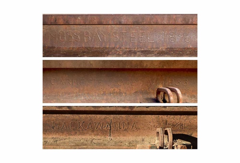 Alguns trilhos ferroviários encontrados na cidade de Valinhos, SP com suas inscrições indicando