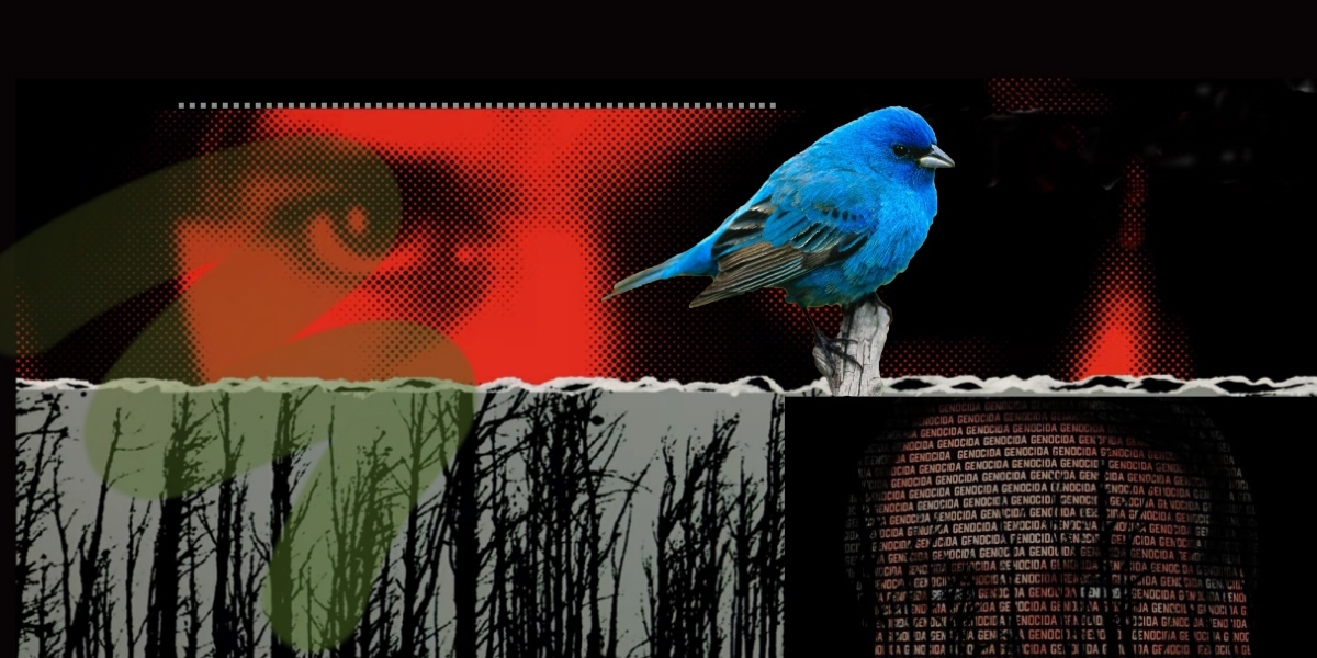 O pássaro azul voa muito alto, volta e continua a cantar.